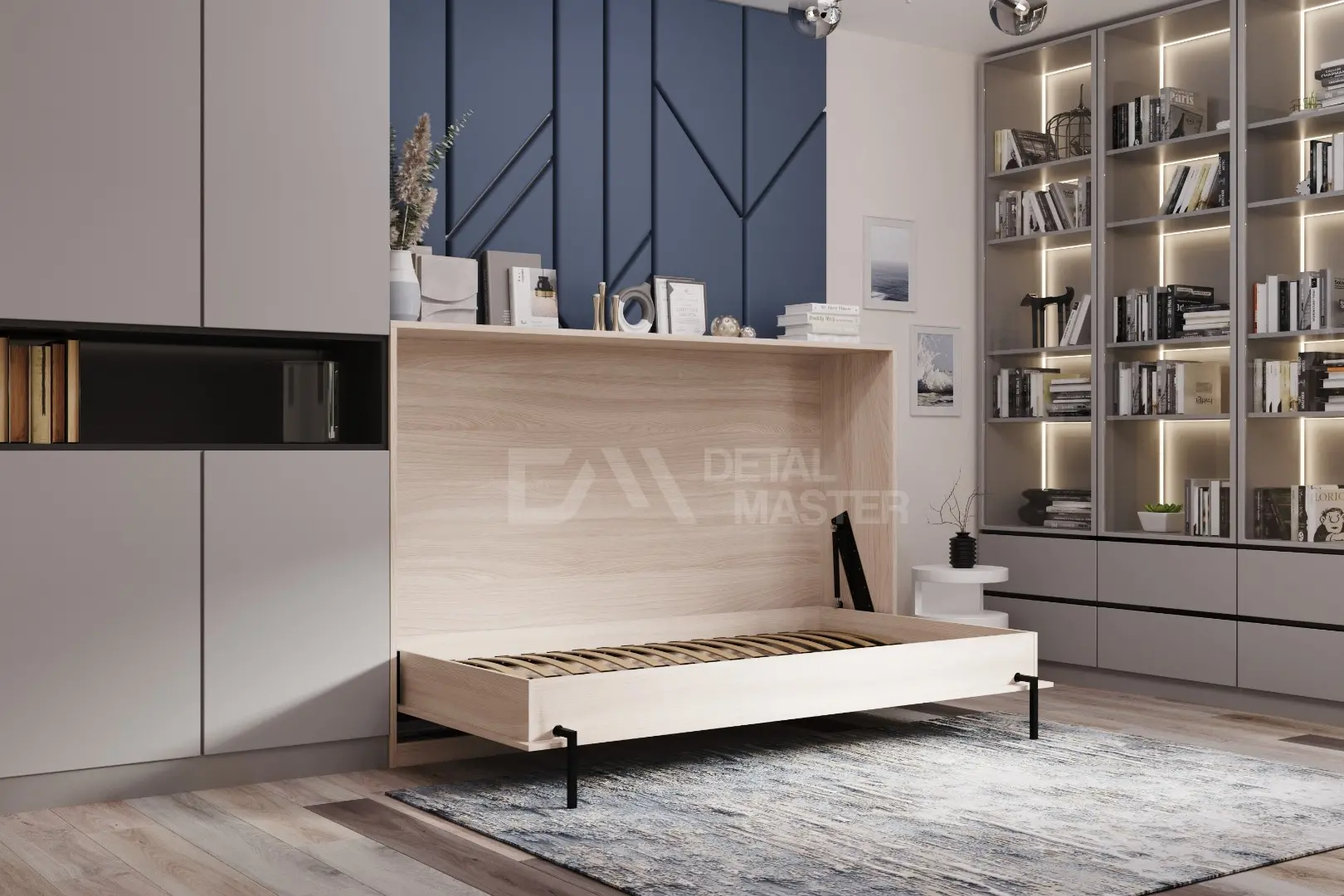 Горизонтальная шкаф-кровать "Solo Start".  Работает на механизме раскладывания собственной разработки "Start". Кровать раскладывается легким движением руки, превращаясь в полноценное спальное место. Просто потяните ее за ручки, расположенные на фасаде и выставите ножки-опоры.